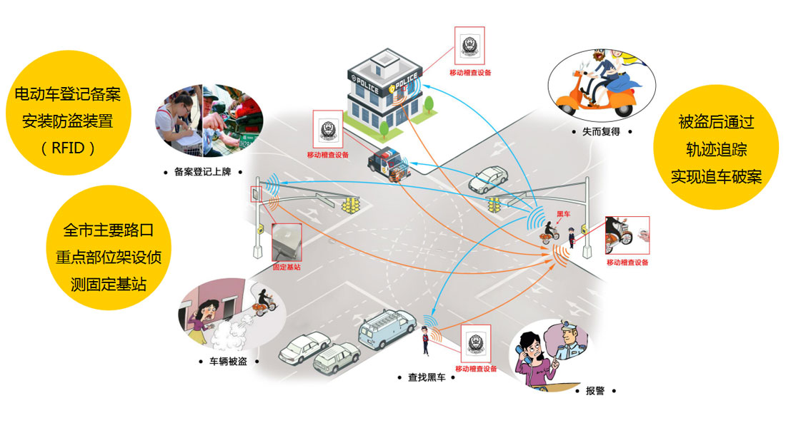 ②RFID芯片---安装在老百姓电动车的任意一个位置,芯片的使用年限为3年 通过芯片发射信号,基站接收信号,从而形成整个电动车的移动轨迹,方便在公安追回过程中查找车辆信息。③手持设备----该设备在车辆被盗后解决最后的20米的精确定位问题,被盗车辆无论是在车库或者家里,让其无处可逃。